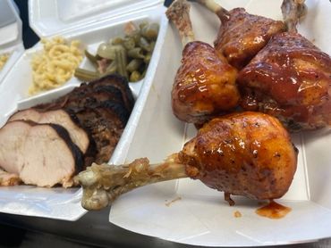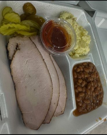 meat choices: pulled pork, smoked brisket, ribs, sausage, chicken and turkey